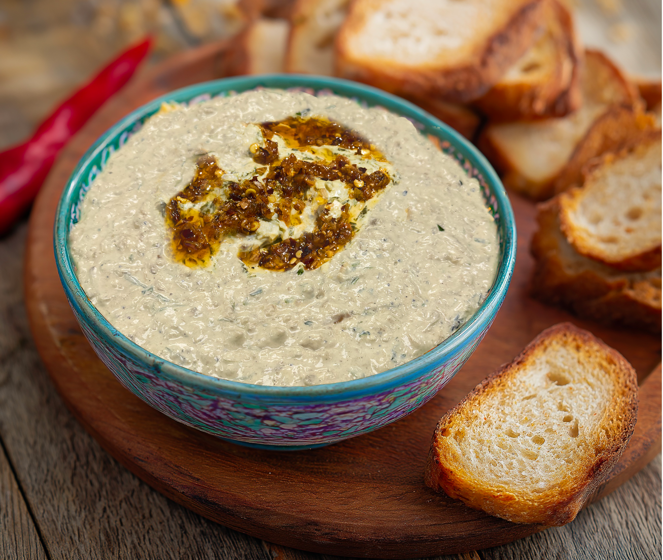 Tangy, protein-rich & probiotic packed Yaza labneh serves as the perfect base to mix with caramelized onions, parsley, & chives for this classic twist on French Onion Dip topped with our Calabrian Chili Crunch.