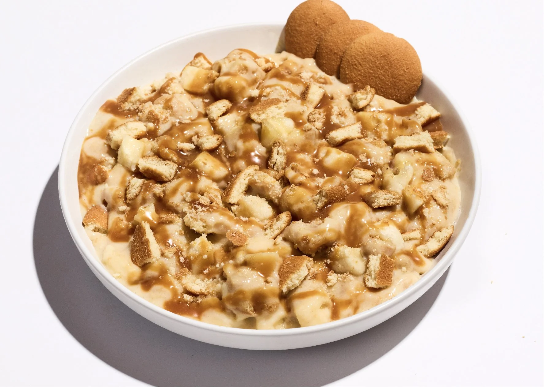 A fresh banana diplomat cream topped with a whiskey butter caramel, seared banana chips, and toasted vanilla wafers.