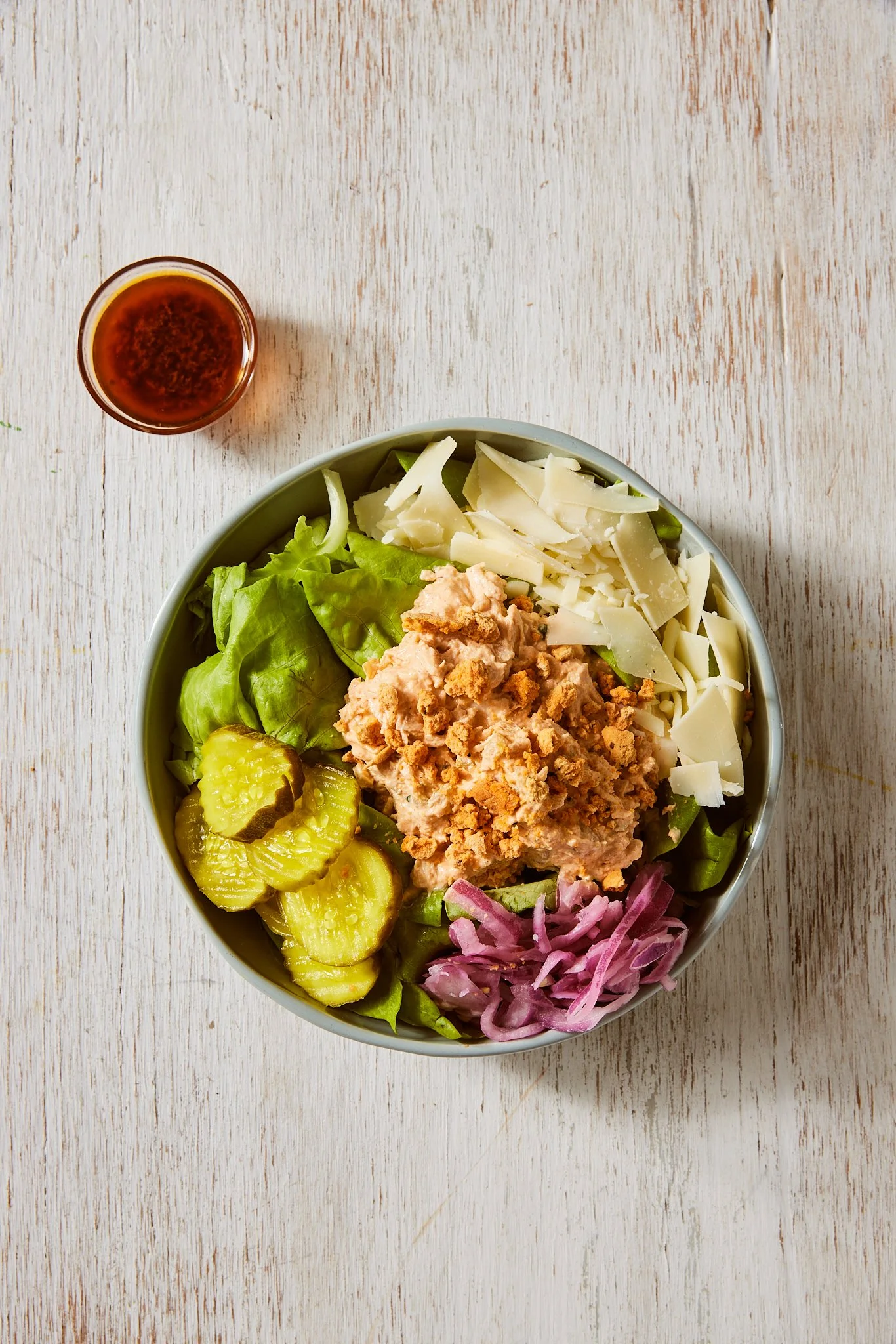 Our Hot "Fried" Chicken Dip on butter lettuce topped with pickled onion, spicy crunchies, bread & butter pickles, shredded cheese, and chermoula honey mustard dressing.