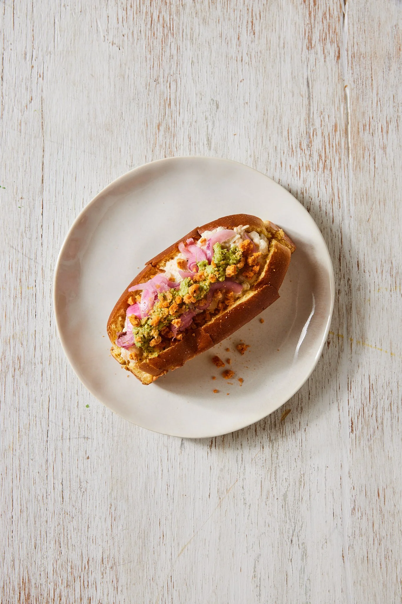 Our Low Country Shrimp Dip featuring wild-caught Georgia shrimp pared and tossed in the classic low country favorite Old Bay seasoning, celery, fennel, and lemon topped with cIlantro salsa verde, spicy crunchies, pickled onions on a toasted lobster roll.