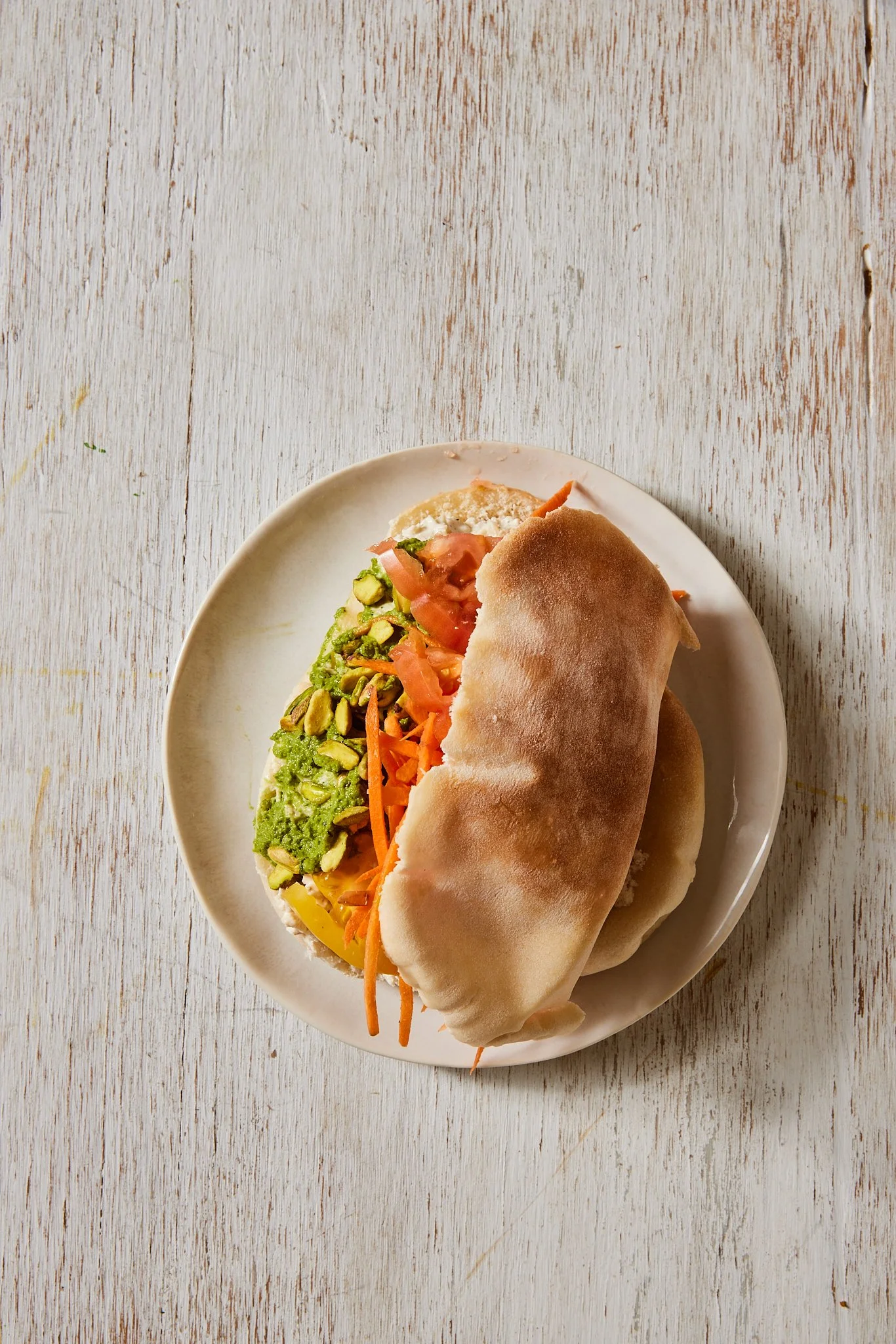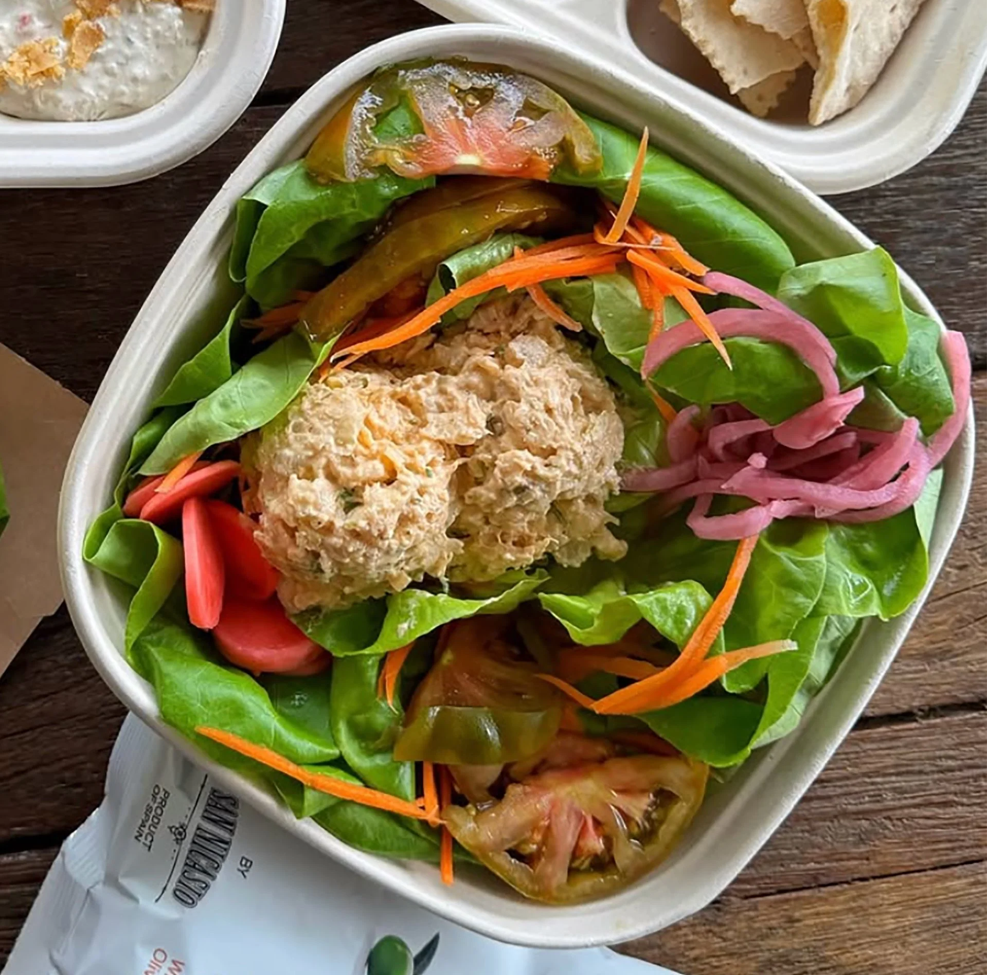Our Slow Roasted Chicken Salad featuring free-range local chicken roasted 18 hours then mixed with aromatic fennel & shallot and blended with parsley, lemon zest & just a touch of dill, topped with schug sauce, pistachios, shaved carrots, heirloom tomatoes inside a pita pocket.