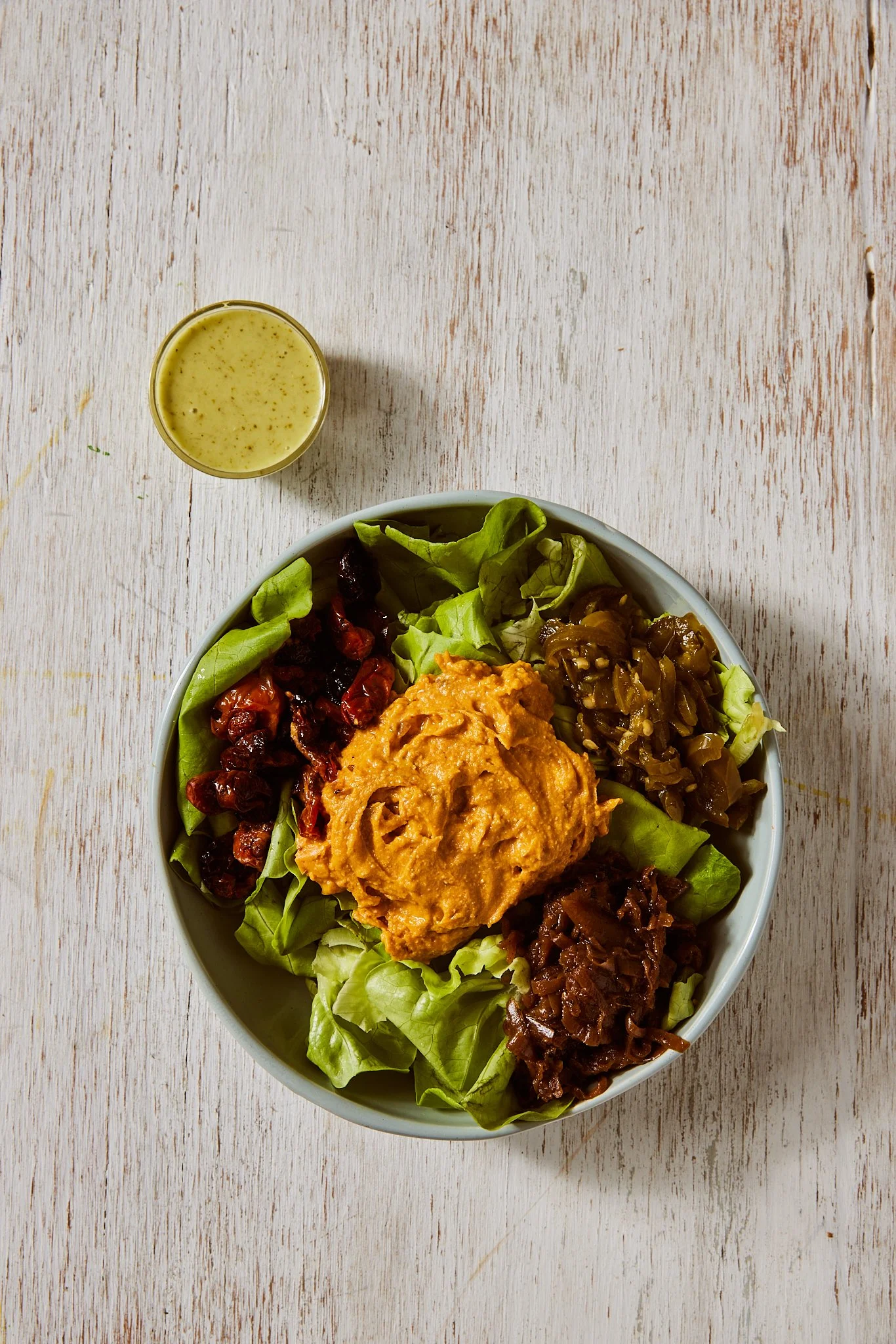 Our Smokey Vegan Queso Dip on butter lettuce topped with hot honey jalapeños, caramelized onions, blistered tomatoes, and our homemade cilantro lime vinaigrette.