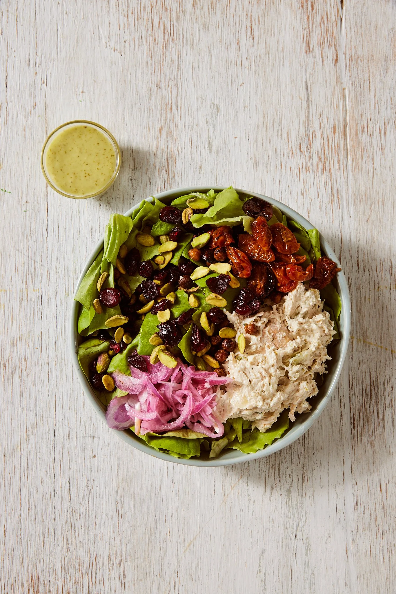 Our Slow Roasted Chicken Salad on butter lettuce with blistered tomatoes, shawarma chickpeas, dried cranberries, toasted pistachios, onions, and our homemade cilantro lime vinaigrette.