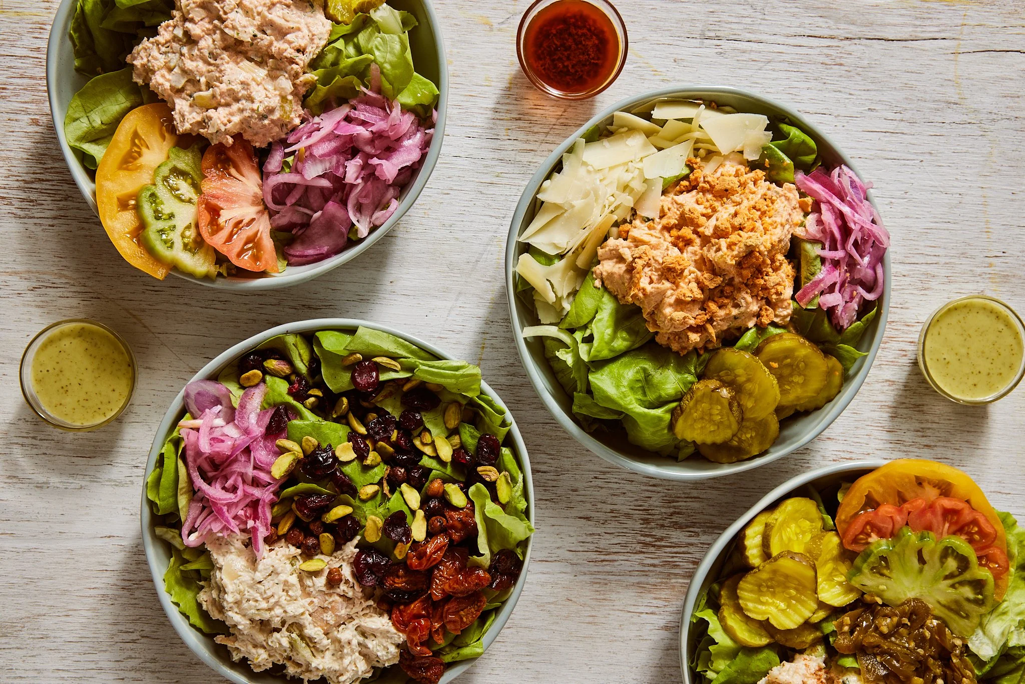 Create your own salad by picking a Signature or Seasonal dip, your toppings, and one of our homemade dressings.