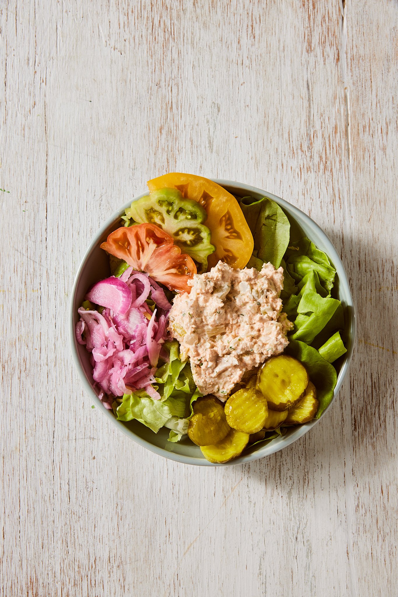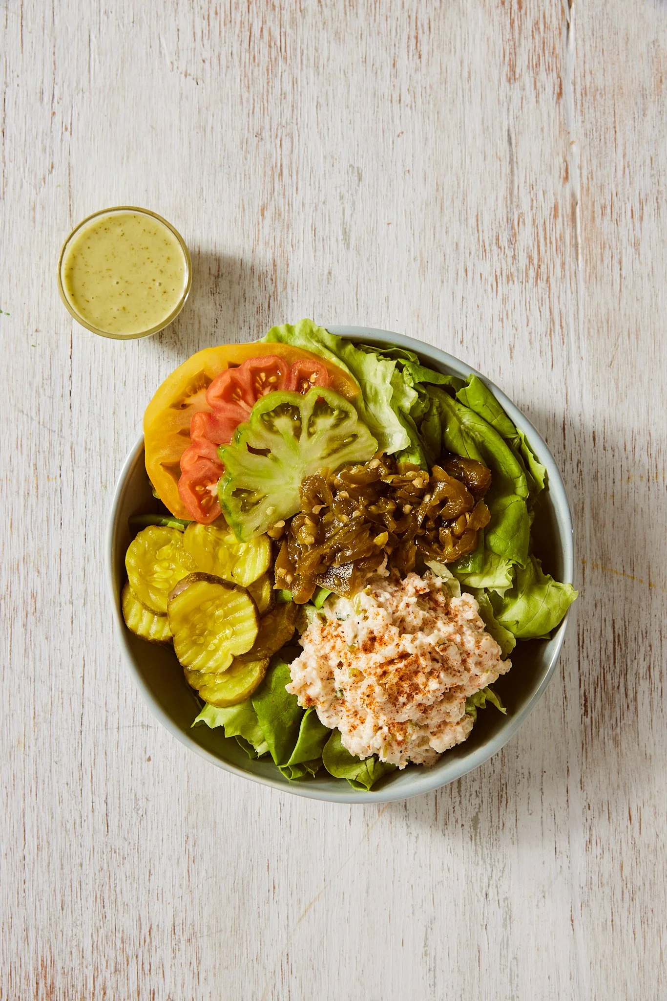 Our Lobster & Clam Chowder Dip on butter lettuce topped with pickled onions, sliced heirloom tomatoes, shredded cheese, and B&B pickles.
