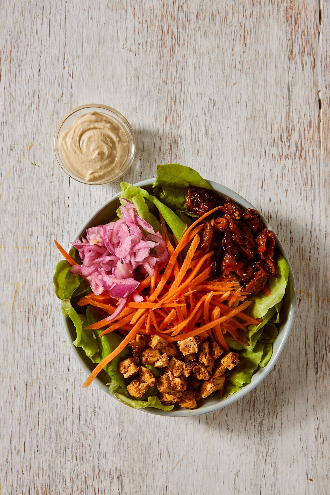 Merguez Tofu, blistered tomatoes, pickled onions, shaved carrots, almond crumble on butter lettuce topped with our homemade B&B tahina dressing.